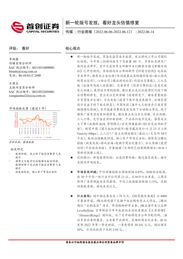 【首创证券】【20220614】新一轮版号发放,看好龙头估值修复-13页