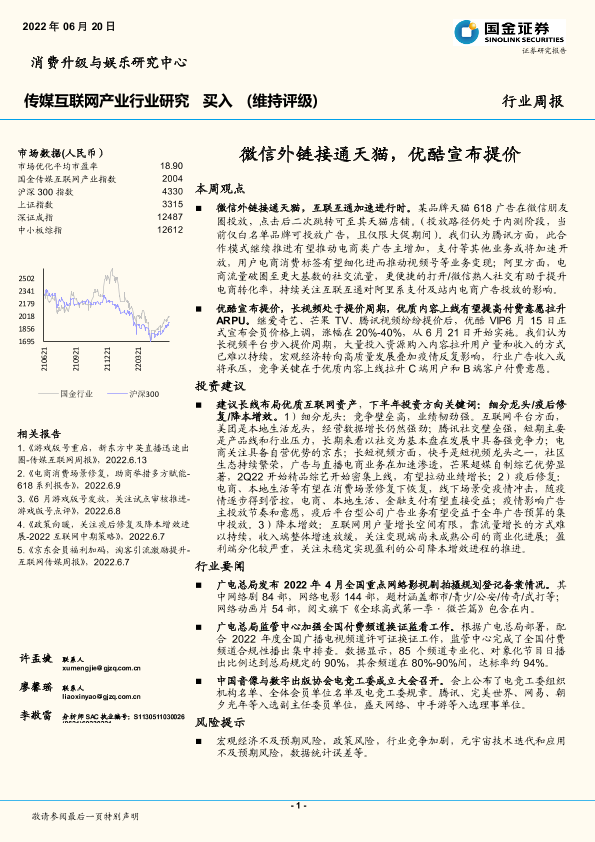 【国金证券】【20220620】传媒互联网产业行业周报:微信外链接通天猫,优酷宣布提价-17页