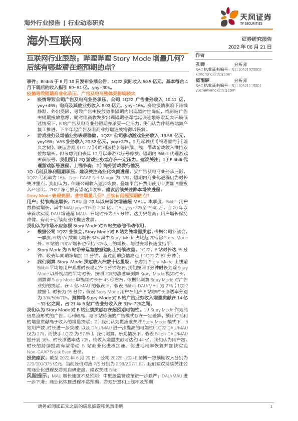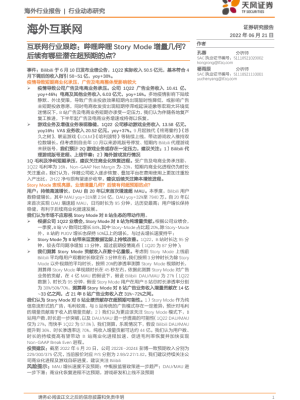 【天风证券】【20220621】互联网行业跟踪:哔哩哔哩Story Mode增量几何?后续有哪些潜在超预期的点?-4页