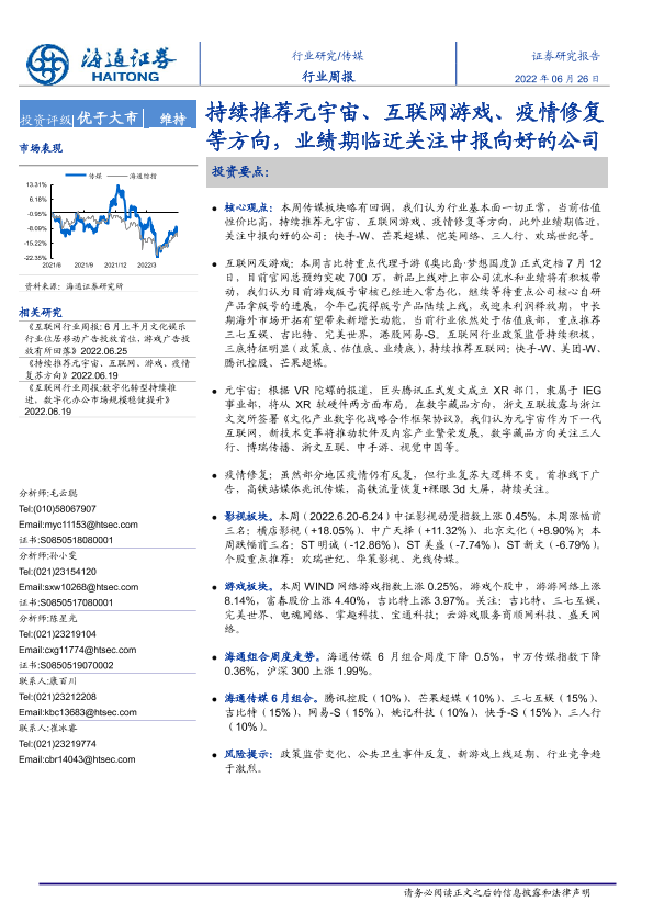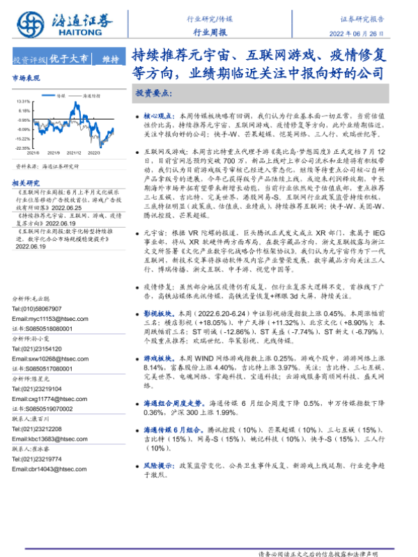 【海通证券】【20220626】传媒行业周报:持续推荐元宇宙、互联网游戏、疫情修复等方向,业绩期临近关注中报向好的公司-10页