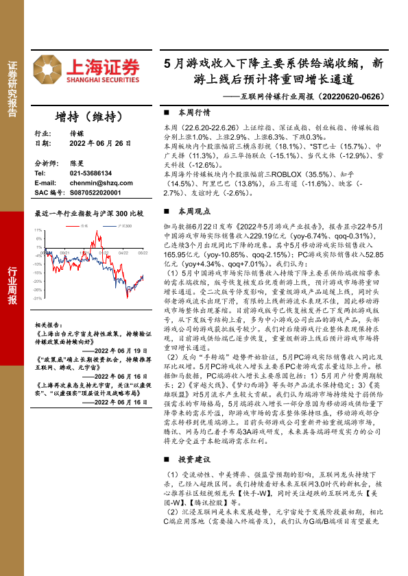 【上海证券】【20220626】5月游戏收入下降主要系供给端收缩,新游上线后预计将重回增长通道-23页