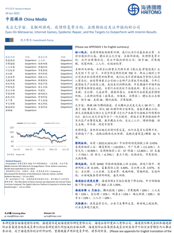 【海通国际】【20220629】中国媒体:关注元宇宙、互联网游戏、疫情修复等方向,业绩期临近关注中报向好公司-15页
