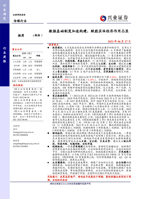 传媒行业 实体经济 数据基础制度 文化传媒投资 游戏版号