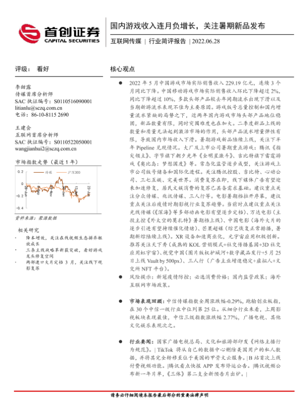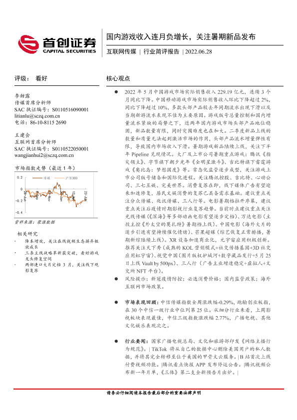 【首创证券】【20220628】国内游戏收入连月负增长,关注暑期新品发布-11页