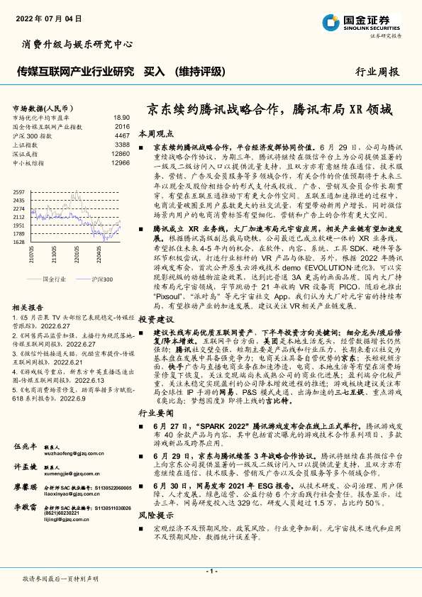 【国金证券】【20220704】传媒互联网产业行业研究:京东续约腾讯战略合作,腾讯布局XR领域-17页