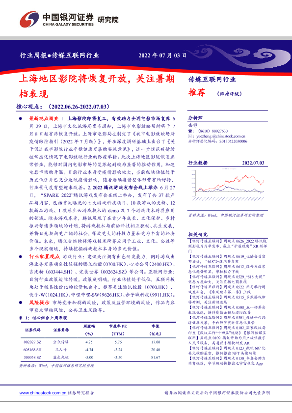 【银河证券】【20220703】传媒互联网行业周报:上海地区影院将恢复开放,关注暑期档表现-43页