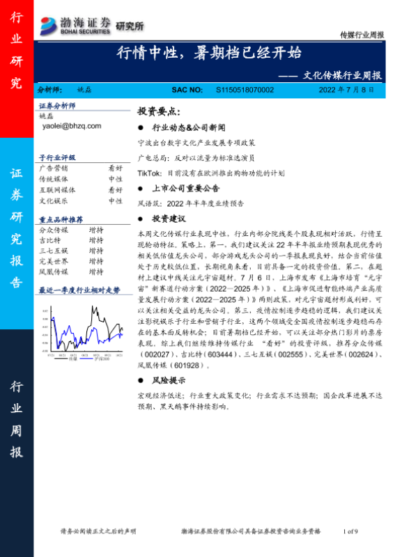【渤海证券】【20220708】文化传媒行业周报:行情中性,暑期档已经开始-9页
