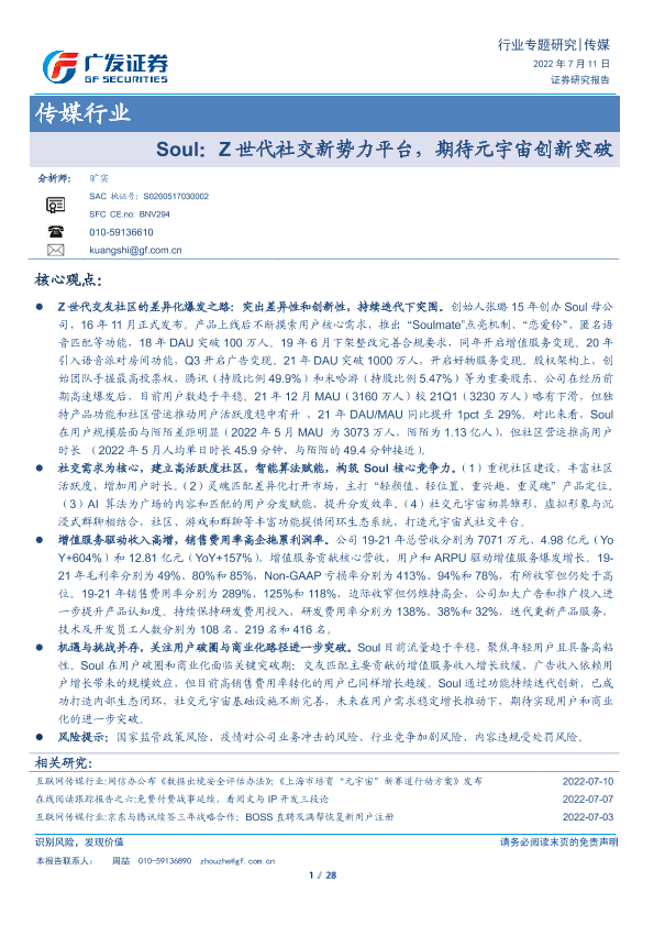 【广发证券】【20220711】Soul:Z世代社交新势力平台,期待元宇宙创新突破-28页