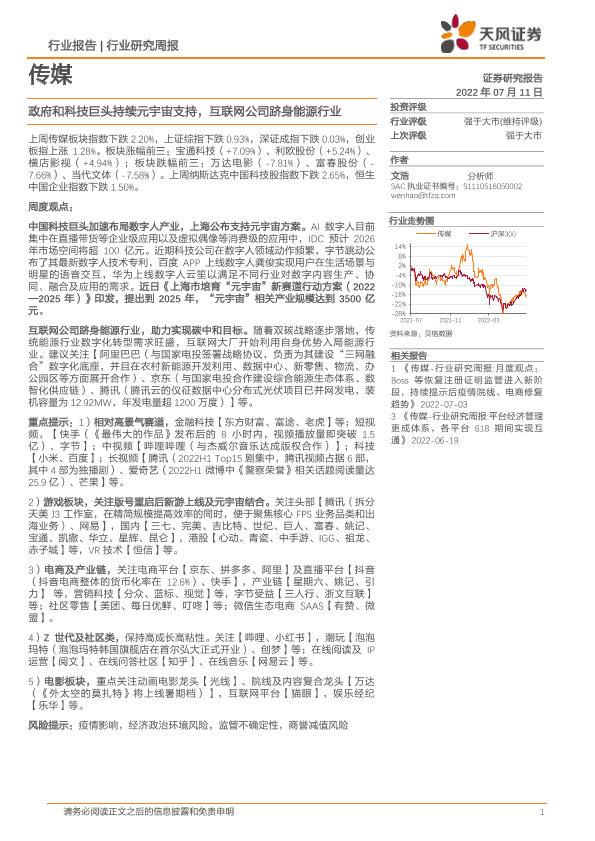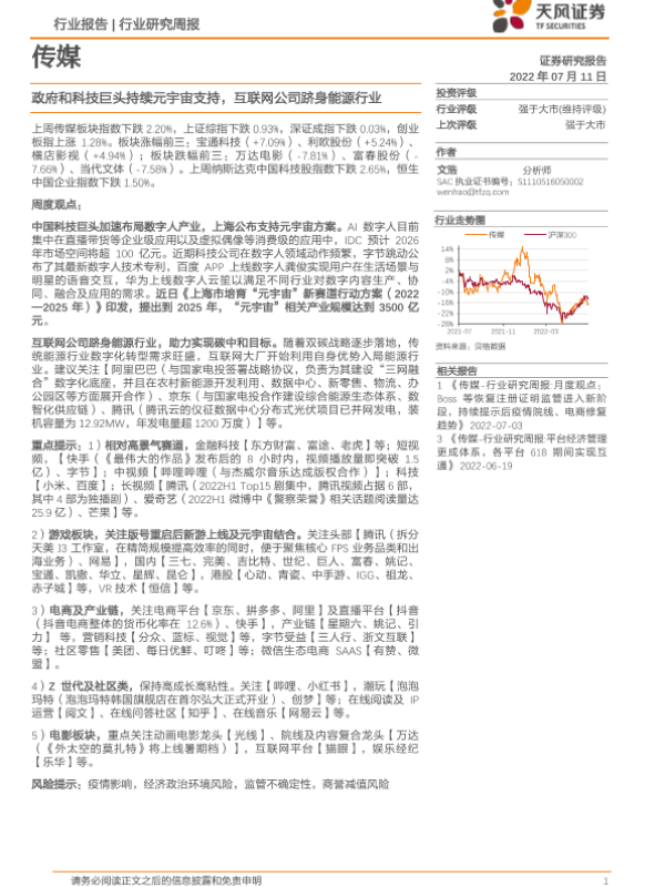 【天风证券】【20220711】传媒行业研究周报:政府和科技巨头持续元宇宙支持,互联网公司跻身能源行业-14页