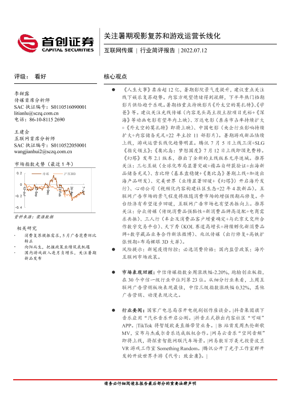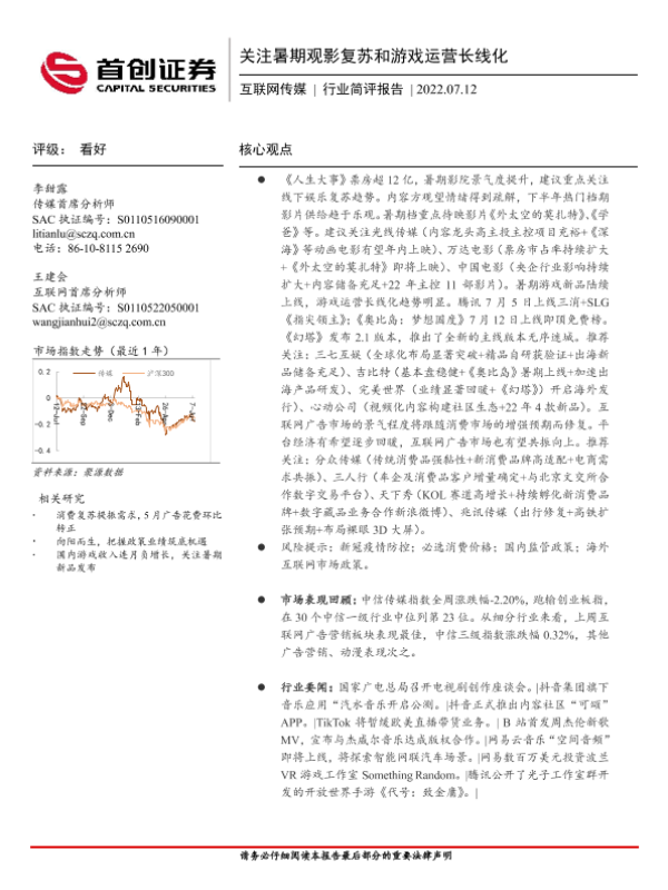 【首创证券】【20220712】关注暑期观影复苏和游戏运营长线化-12页