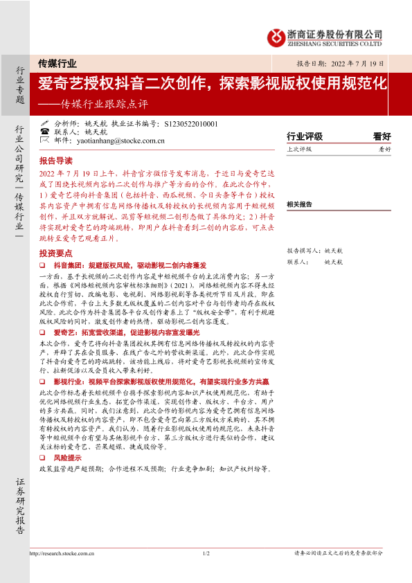 【浙商证券】【20220719】传媒行业跟踪点评:爱奇艺授权抖音二次创作,探索影视版权使用规范化-2页