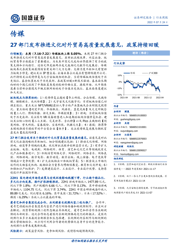 【国盛证券】【20220724】27部门发布推进文化对外贸易高质量发展意见,政策持续回暖-10页