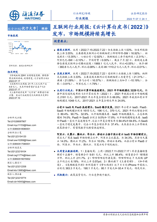 【海通证券】【20220724】互联网行业周报:《云计算白皮书(2022)》发布,市场规模持续高增长-9页