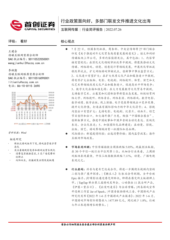 【首创证券】【20220726】互联网传媒行业简评报告:行业政策面向好,多部门联发文件推进文化出海-13页