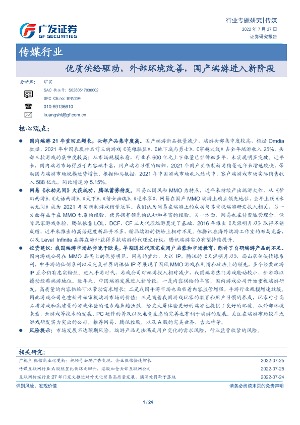 【广发证券】【20220727】传媒行业:优质供给驱动,外部环境改善,国产端游进入新阶段-24页