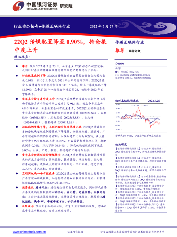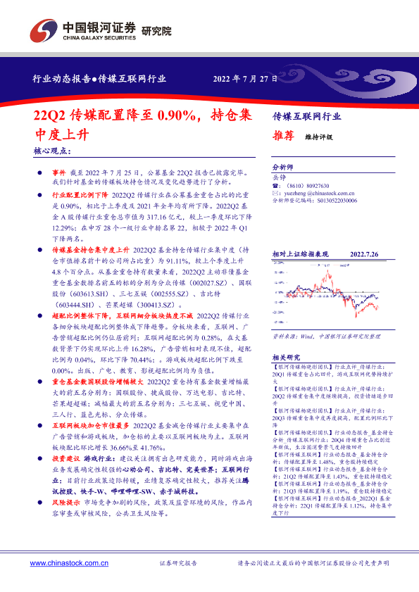 【银河证券】【20220727】22Q2传媒配置降至0.90%,持仓集中度上升-12页