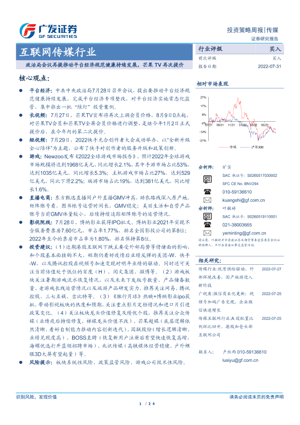 【广发证券】【20220731】互联网传媒行业:政治局会议再提推动平台经济规范健康持续发展,芒果TV再次提价-24页