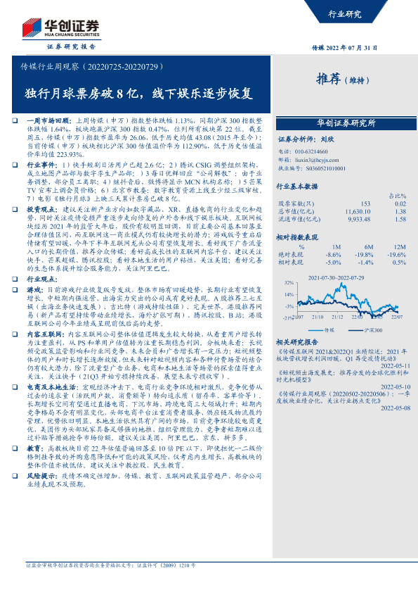 【华创证券】【20220731】传媒行业周观察:独行月球票房破8亿,线下娱乐逐步恢复-21页