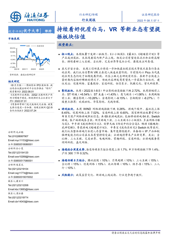【海通证券】【20220807】持续看好优质白马,VR等新业态有望提振板块估值-10页