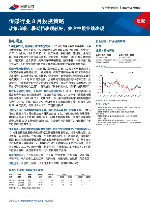 【国信证券】【20220808】8月投资策略:政策趋暖、暑期档表现较好,关注中报业绩表现-16页
