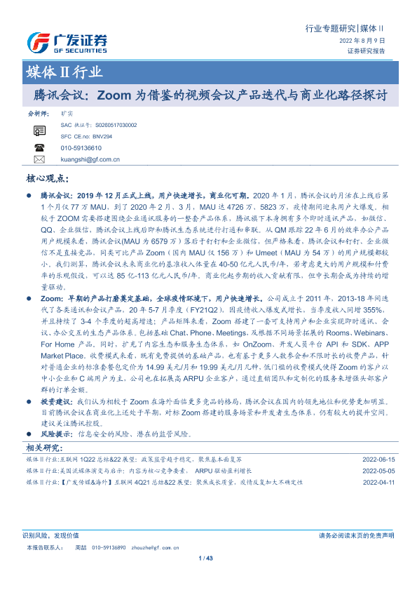 【广发证券】【20220809】腾讯会议:Zoom为借鉴的视频会议产品迭代与商业化路径探讨-43页