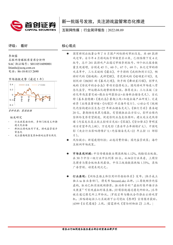 【首创证券】【20220809】新一批版号发放,关注游戏监管常态化推进-12页