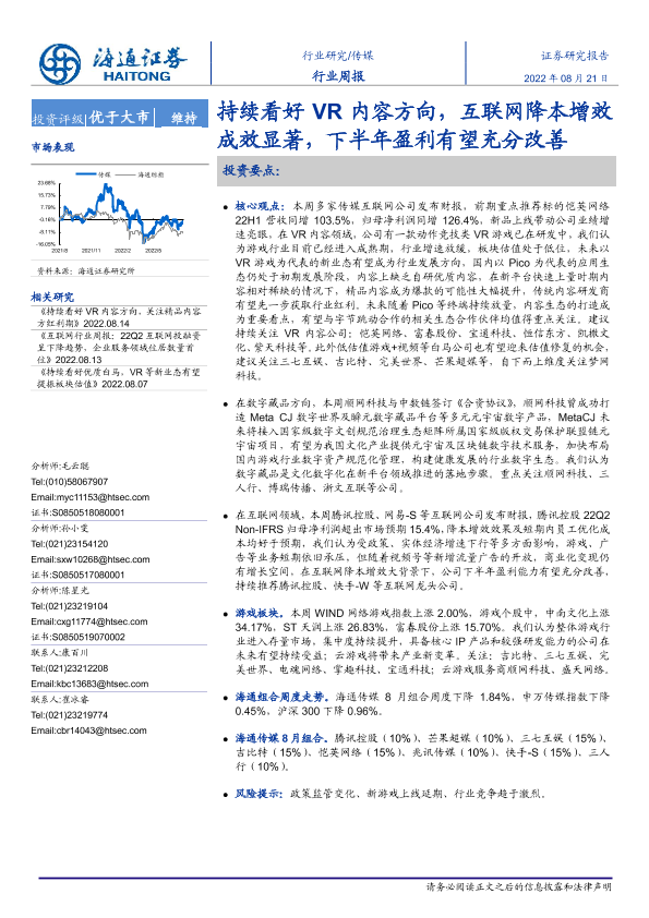 【海通证券】【20220821】传媒行业周报:持续看好VR内容方向,互联网降本增效成效显著,下半年盈利有望充分改善-10页