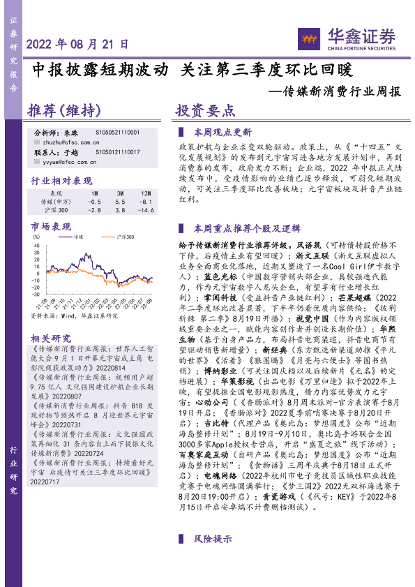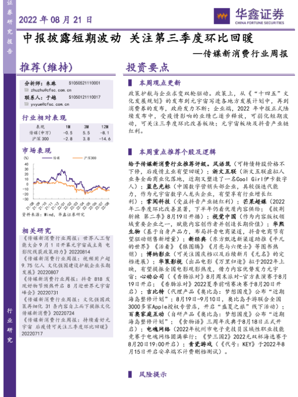 中报披露 新消费 第三季度展望 行业周报 传媒