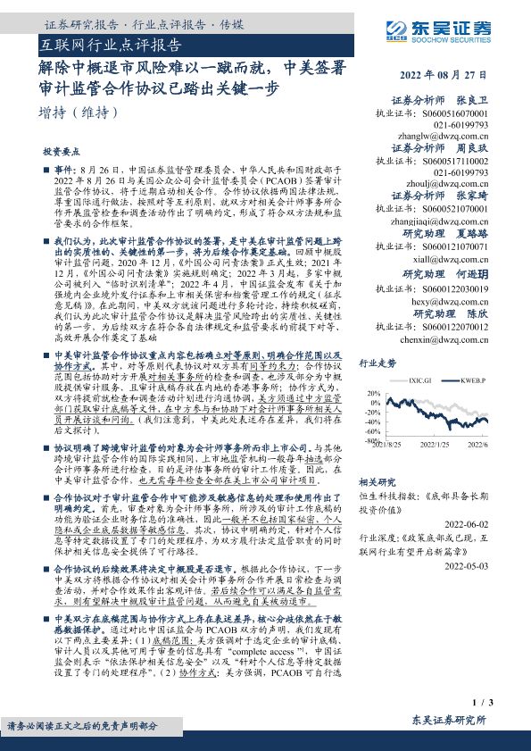 【东吴证券】【20220827】互联网行业点评报告:解除中概退市风险难以一蹴而就,中美签署审计监管合作协议已踏出关键一步-3页