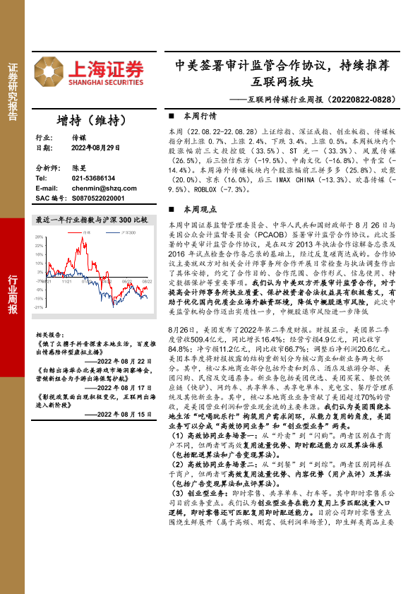 【上海证券】【20220829】互联网传媒行业周报:中美签署审计监管合作协议,持续推荐互联网板块-24页