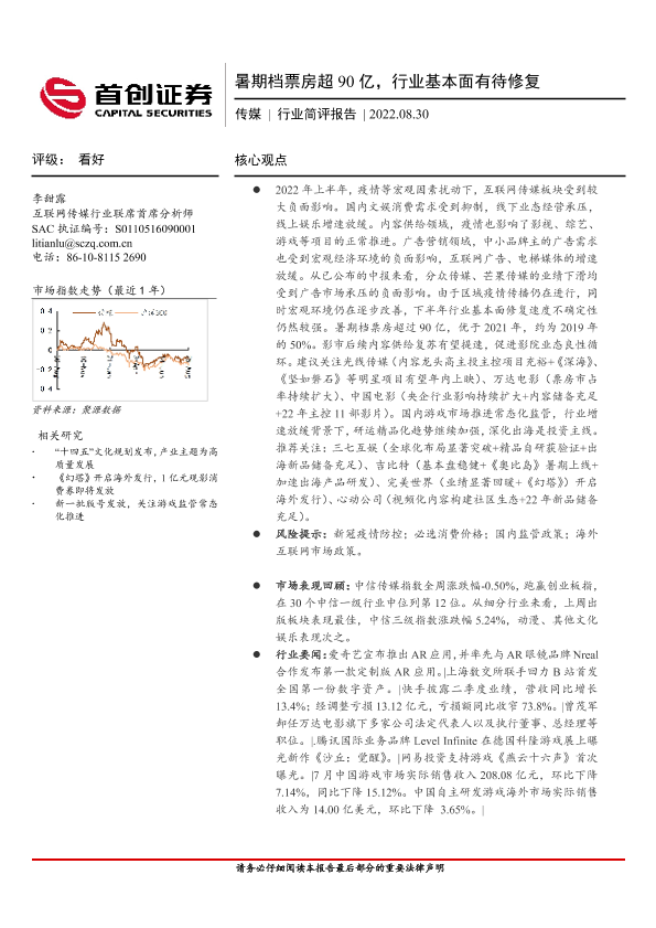 【首创证券】【20220830】暑期档票房超90亿,行业基本面有待修复-19页