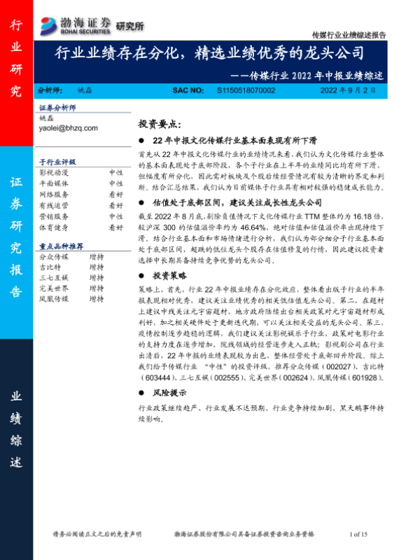 【渤海证券】【20220902】传媒行业2022年中报业绩综述-15页