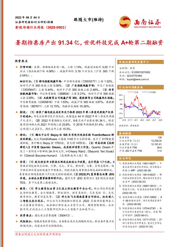 【西南证券】【20220904】影视传媒行业周报:暑期档票房产出91.34亿,世优科技完成A+轮第二期融资-19页