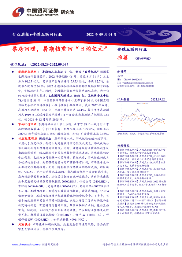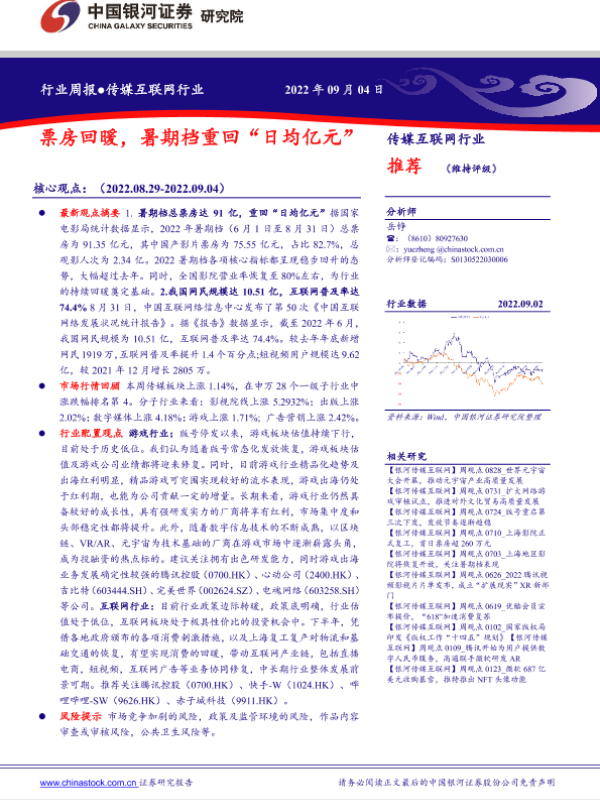 【银河证券】【20220904】传媒互联网行业周报:票房回暖,暑期档重回“日均亿元”-35页