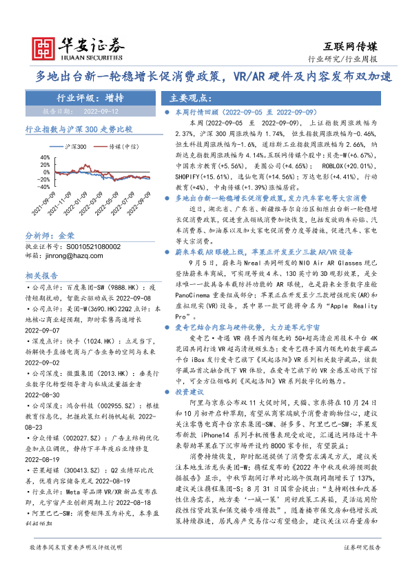 【华安证券】【20220912】互联网传媒行业周报:多地出台新一轮稳增长促消费政策,VR AR硬件及内容发布双加速-22页