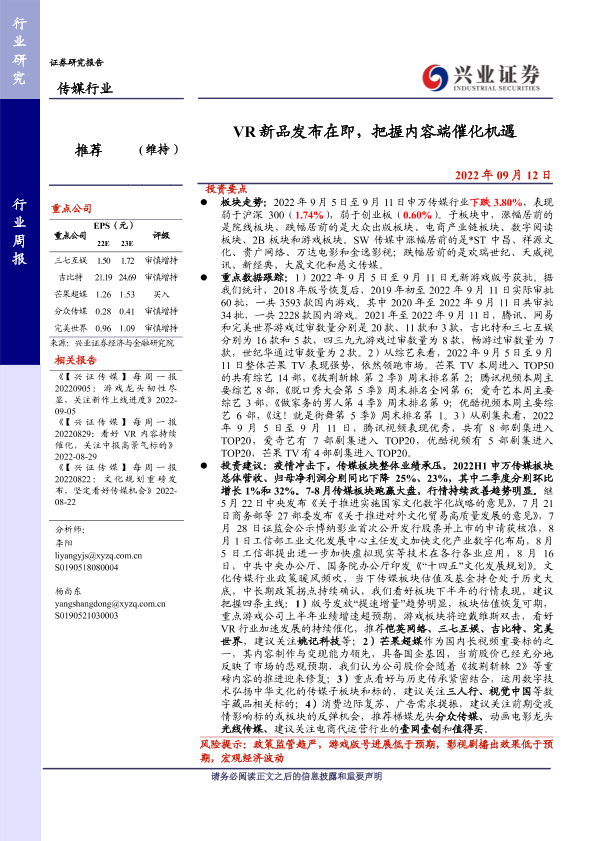 VR新品 传媒行业 内容催化 政策导向 游戏版号