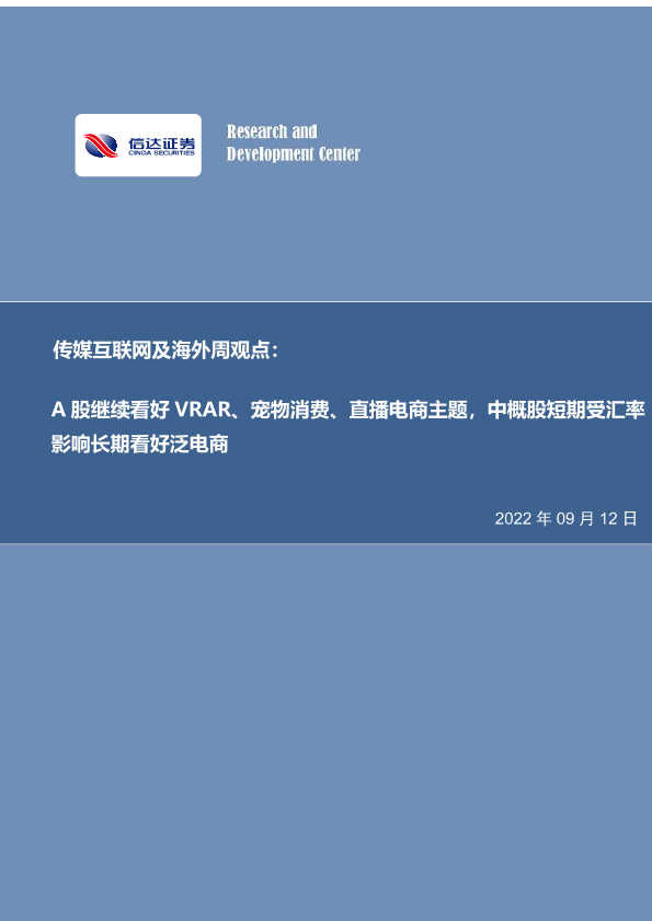 【信达证券】【20220912】A股继续看好VRAR、宠物消费、直播电商主题,中概股短期受汇率影响长期看好泛电商-20页