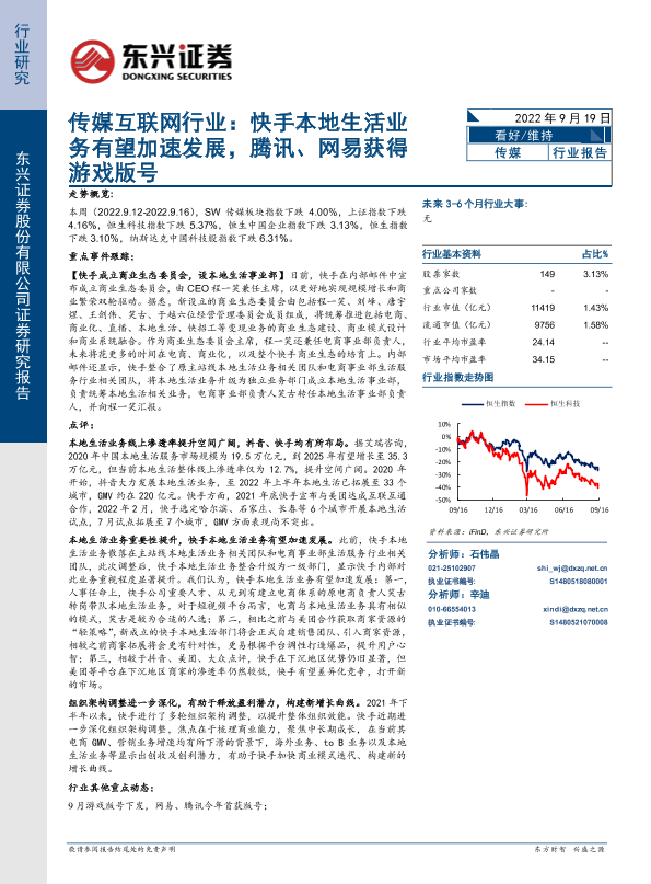 【东兴证券】【20220919】传媒互联网行业:快手本地生活业务有望加速发展,腾讯、网易获得游戏版号-12页