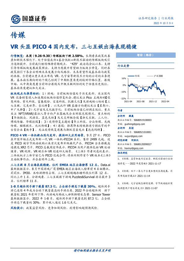 【国盛证券】【20221009】VR头显PICO4国内发布,三七互娱出海表现稳健-10页