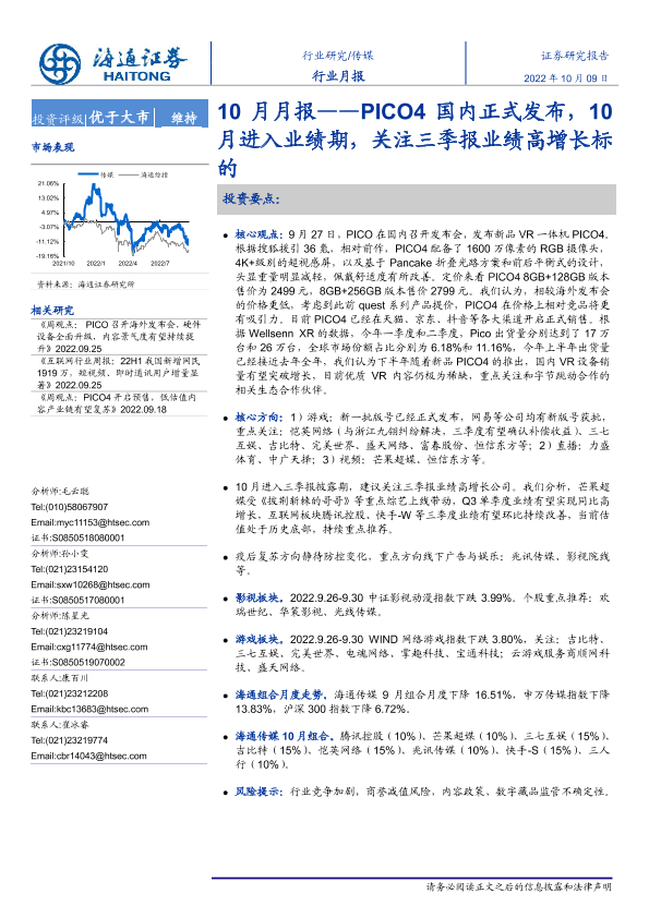 【海通证券】【20221009】10月月报:PICO4国内正式发布,10月进入业绩期,关注三季报业绩高增长标的-12页