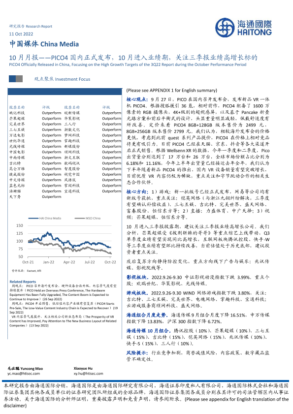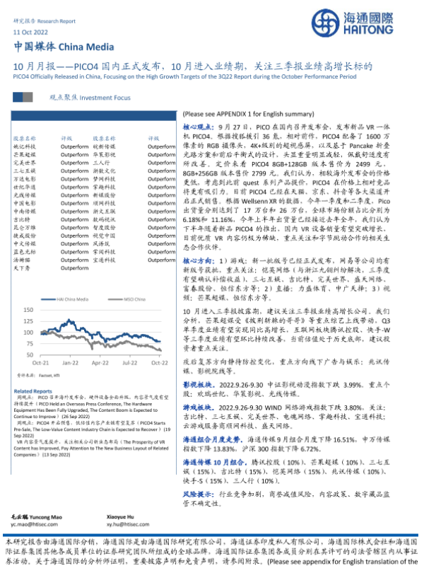 【海通国际】【20221011】10月月报:PICO4国内正式发布,10月进入业绩期,关注三季报业绩高增长标的-17页