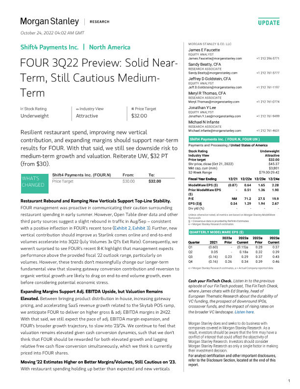 【Morgan Stanley】【20221024】Shift4 Payments Inc. FOUR 3Q22 Preview Solid Near-Term, Still Cautious Medium-Term-13页