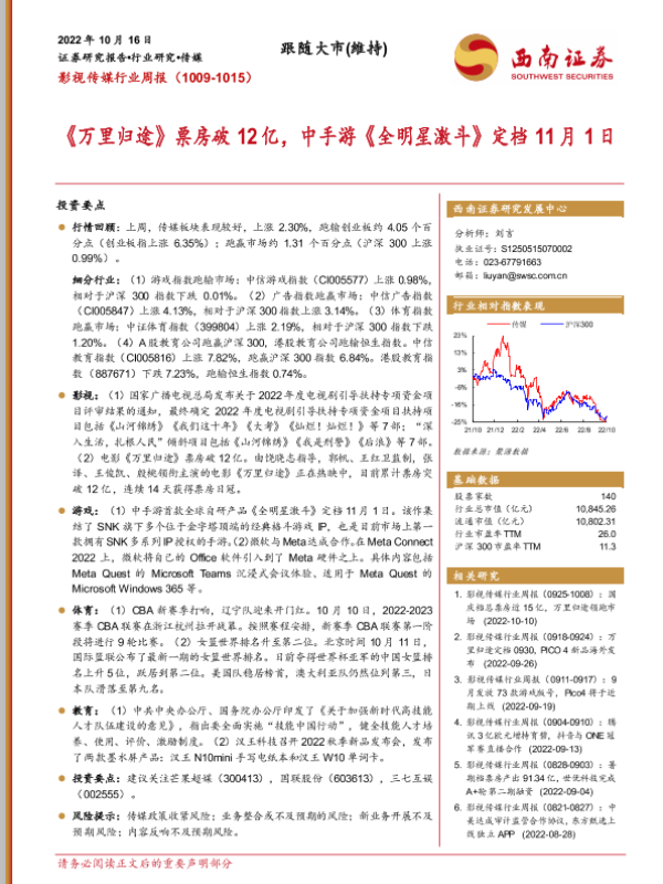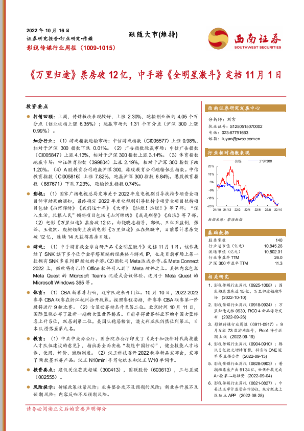 【西南证券】【20221016】影视传媒行业周报:《万里归途》票房破12亿,中手游《全明星激斗》定档11月1日-18页