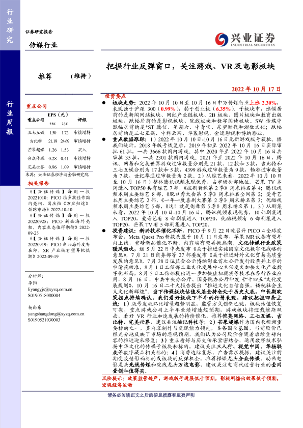 【兴业证券】【20221017】把握行业反弹窗口,关注游戏、VR及电影板块-22页