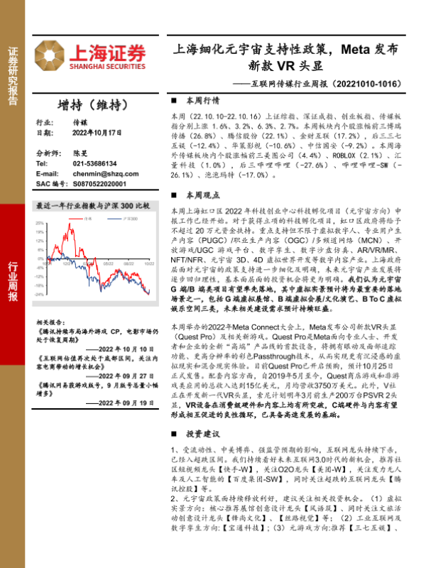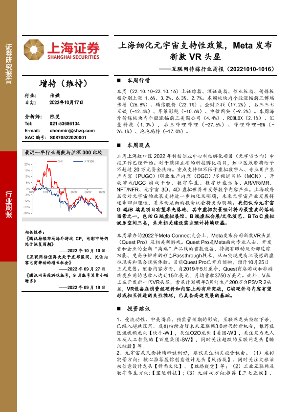 【上海证券】【20221017】互联网传媒行业周报:上海细化元宇宙支持性政策,Meta发布新款VR头显-23页