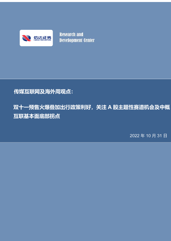 【信达证券】【20221031】传媒互联网及海外周观点:双十一预售火爆叠加出行政策利好,关注A股主题性赛道机会及中概互联基本面底部拐点-27页