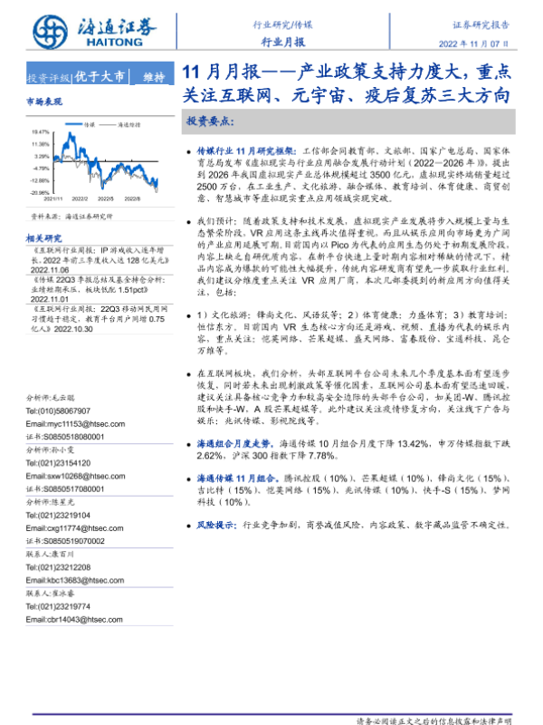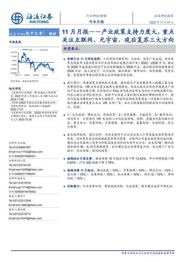 【海通证券】【20221107】传媒11月月报:产业政策支持力度大,重点关注互联网、元宇宙、疫后复苏三大方向-12页