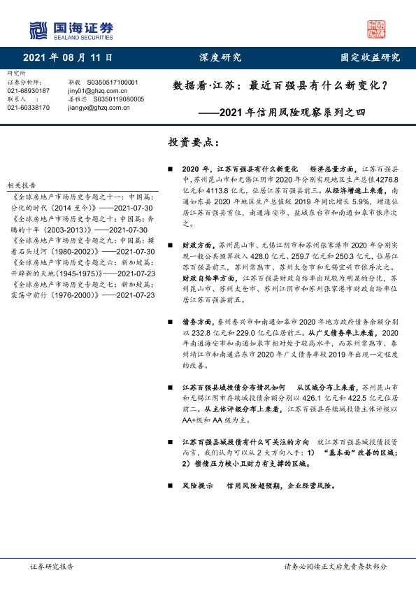 【国海证券】【20210811】2021年信用风险观察系列之四:数据看·江苏,最近百强县有什么新变化?-18页
