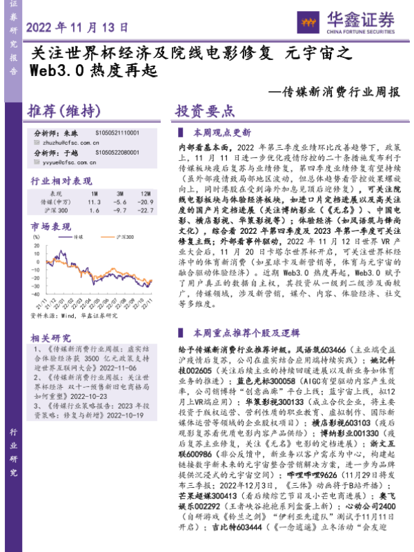 【华鑫证券】【20221113】传媒新消费行业周报:关注世界杯经济及院线电影修复 元宇宙之Web3.0热度再起-20页
