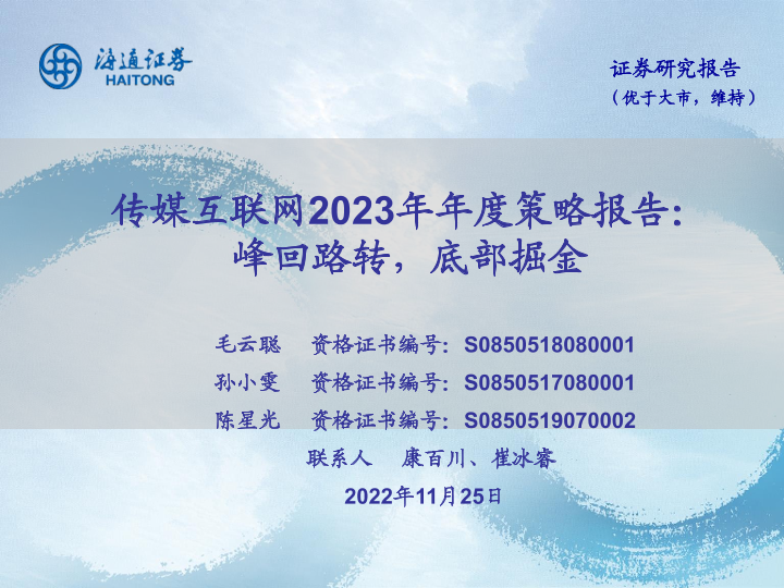 【海通证券】【20221125】传媒互联网2023年年度策略报告:峰回路转,底部掘金-30页